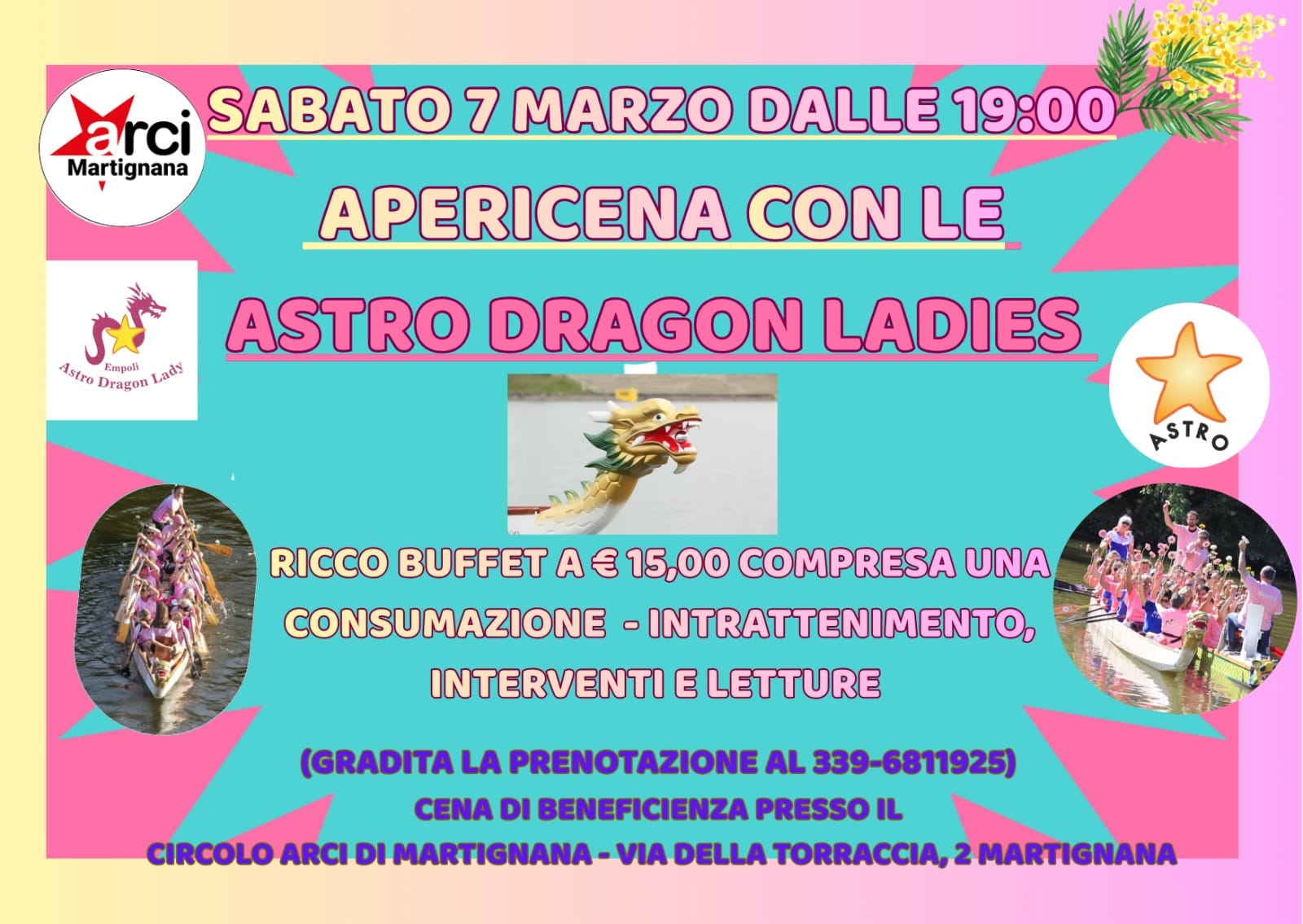 Sabato 7 marzo, a partire dalle 19:00, il Circolo ARCI di Martignana apre le sue porte per un evento speciale dedicato alla Giornata Internazionale della Donna: un’apericena solidale con le Astro Dragon Ladies, in collaborazione con l’Associazione ASTRO.