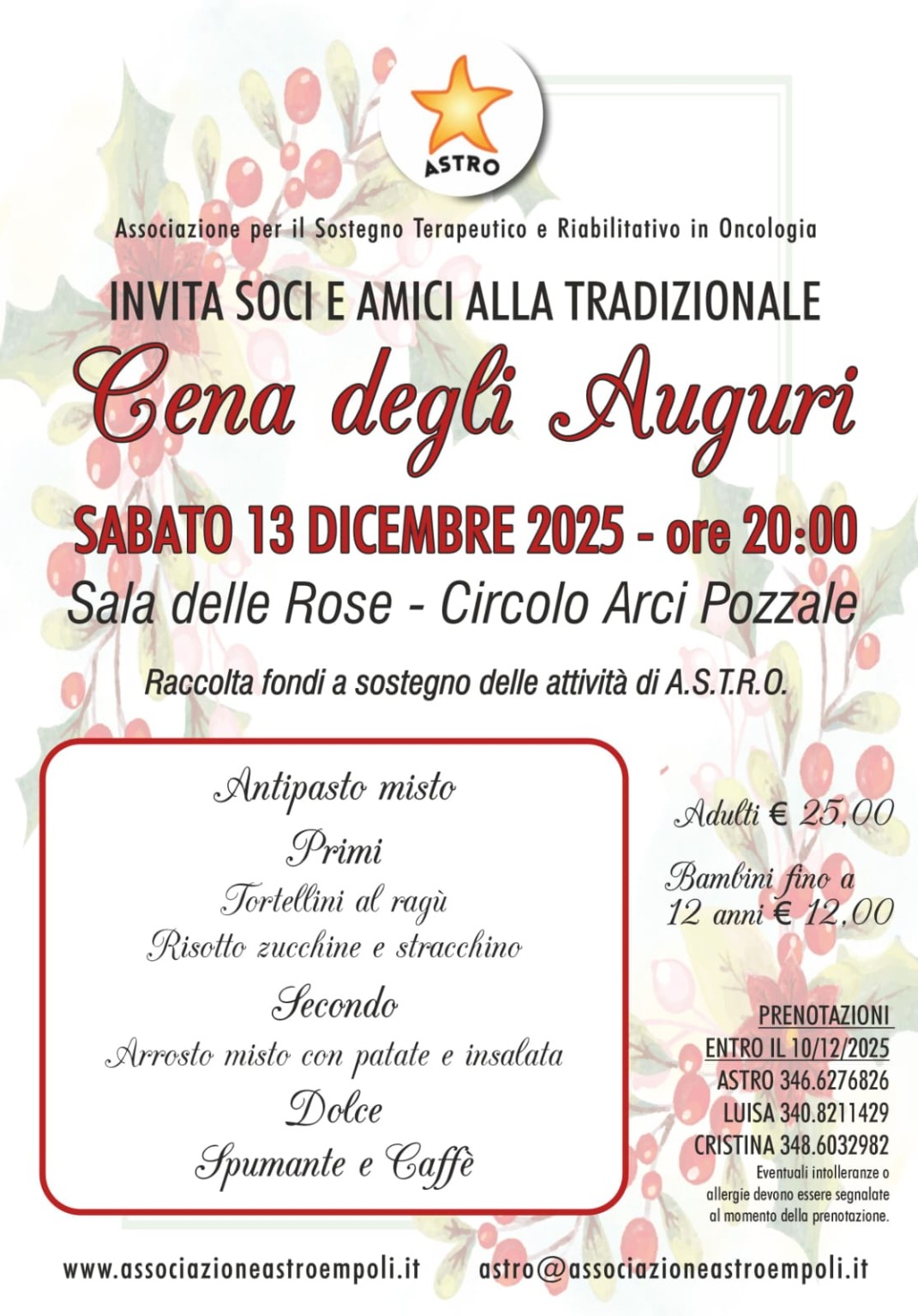 Anche quest’anno l’Associazione ASTRO – Associazione per il Sostegno Terapeutico e Riabilitativo in Oncologia – rinnova l’appuntamento con la Cena degli Auguri, un’occasione speciale per ritrovarsi, scambiarsi abbracci e sorrisi, e sostenere le attività dell’associazione.